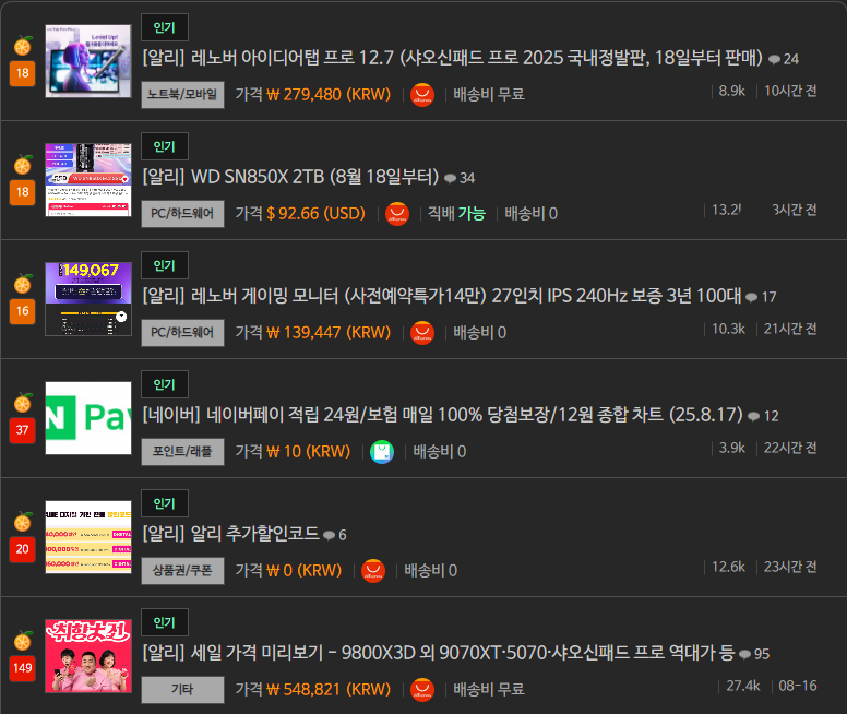 펨코처럼 카테고리를 가리지 않고 다양한 핫딜이 올라옵니다.